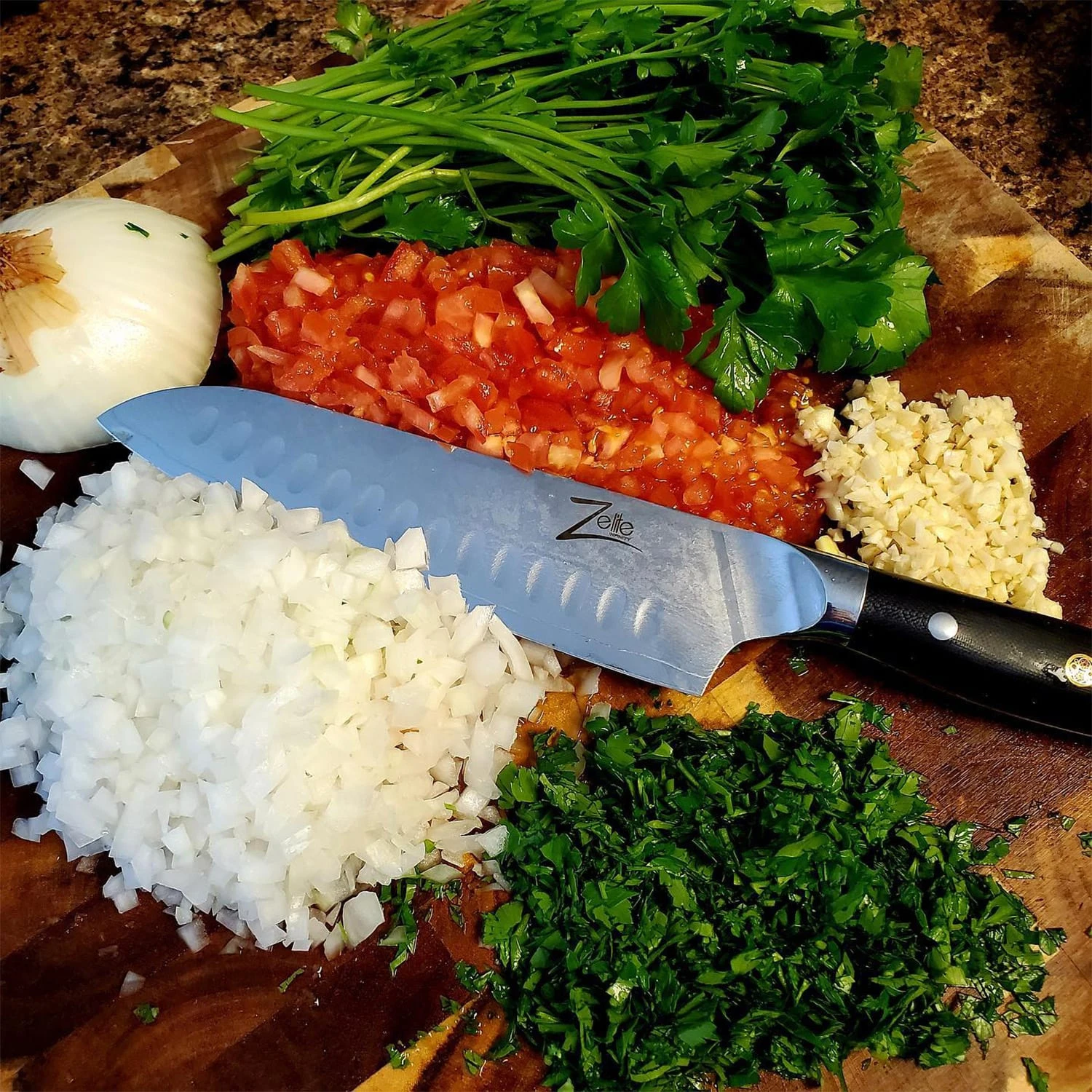 Hervorragende Schnitthaltigkeit verbunden mit Langlebigkeit, ultimativer Klingenschärfe und einem außergewöhnlichen Antlitz: Das ist das exklusive 7″ Santoku-Messer der Alpha-Royal Japanese Serie von Zelite Infinity by Klarstein. Die fernöstliche Edition des westlichen Kochmessers ist durch ihre breite und flache Klinge der Pionier im Hacken, Zerkleinern und Schneiden. Die Zutaten rutschen dank der Einkerbungen in der Schneide galant vom Messer und landen sicher im Topf.