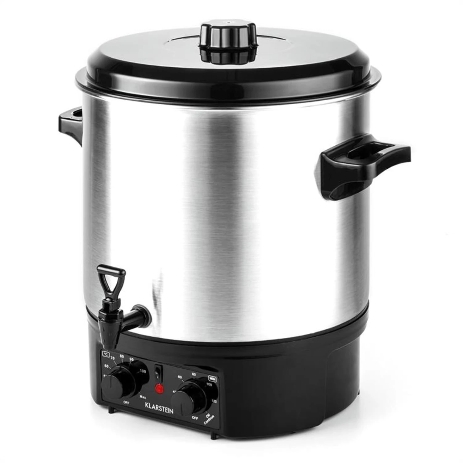 Das 2000 Watt starke Heizaggregat des Klarstein-Einkochautomaten und der Zapfhahn qualifizieren das Gerät überdies zur gewerblichen oder privaten Nutzung als Heißgetränkespender – etwa an glühweinseligen Feierabenden oder auch als mildtätiger Kaffee- oder Teespender im Hotelgewerbe, im Eventbereich oder im Catering. Bei einer maximalen Füllmenge versorgt der Getränkespender mittelgroße Menschengruppen oder Laufkundschaften.