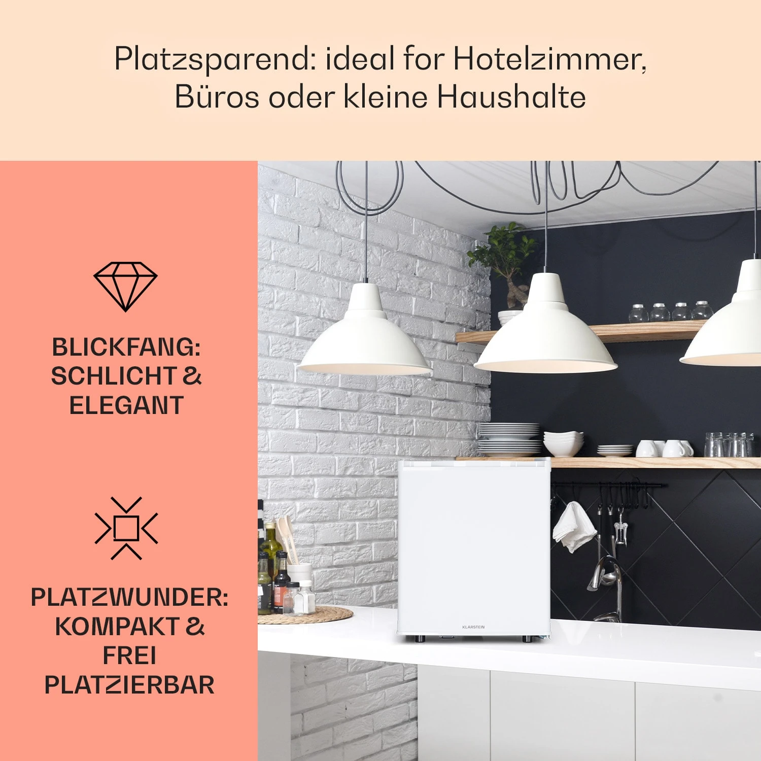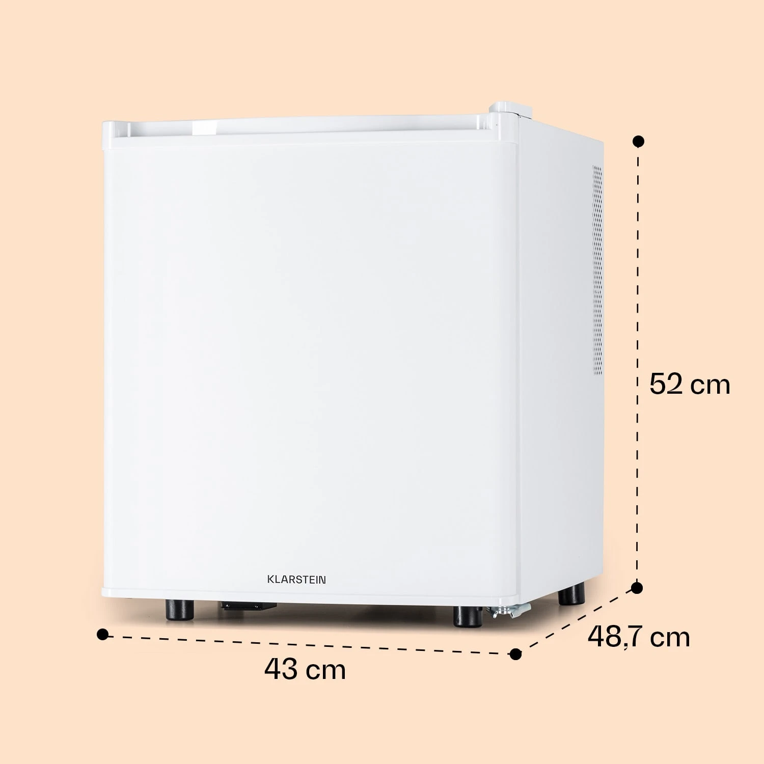 Platzsparend kühle Snacks und Drinks lagern: Der Happy Hour 45 Kühlschrank von Klarstein ist aufgrund seines besonders geräuscharmen Betriebs mit nur 26 dB und der kompakten Größe perfekt für kleine Haushalte, fürs WG-Zimmer oder Büro und besonders für Schlaf- und Gästezimmer geeignet. In seinem 45 Liter großen Innenraum finden auf 3 Ebenen allerlei Speisen, Getränke und Lebensmittel Platz. Zwei Gitterböden können auf acht Einschüben je nach Bedarf des Kühlschrankinhalts eingesetzt werden, während Eier, Butter und auch große Getränkeflaschen bis 2 Liter in den Türfächern Platz finden.