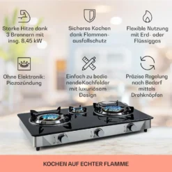 Barzona 3 Campingkocher 3 Brenner 3,4 KW & 0,75 KW & 4,3 KW Glasplatte & Edelstahlgehäuse