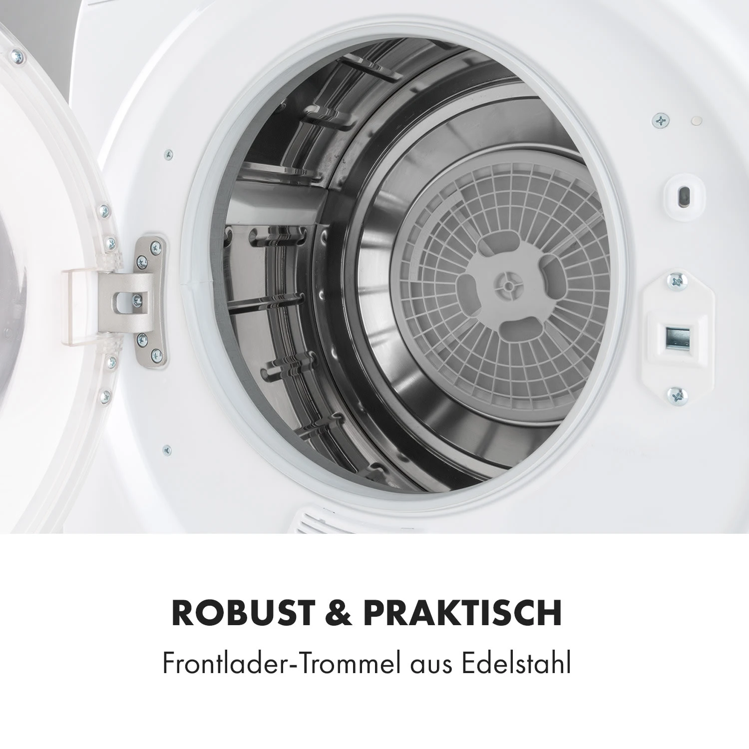 Trocken in Rekordzeit: Der Klarstein Jet Set 2500 Wäschetrockner geht frisch gewaschenen, feuchten Kleidungsstücken, Handtüchern oder Bettbezügen mit 850 W Leistung in zwei Heizstufen ungestüm an die Wäsche und verleiht ihnen trocken-warme Flauschequalitäten. Wer einmal frische Kleidung oder Bettzeug aus dem Trockner genossen hat, will das sanfte, weiche Gefühl nicht mehr missen. Und damit alle in diesen Genuss kommen können, ist der Klarstein Jet Set 2500 Wäschetrockner mit unserem CompactDry Concept besonders platzsparend gestaltet. So findet er auch in vielen kleinen Wohnungen oder Wohnheimen seinen Platz, wo man sich bisher mit sperrigen Wäscheständern irgendwie behelfen musste – oder er verschwindet direkt unter einer Arbeitsplatte. Bis zu 2,5 kg Wäsche passen in die praktische Frontlader-Edelstahl-Trommel. Dann noch die passende Wärmestufe wählen und den Timer zwischen 20 und 200 Minuten einstellen.