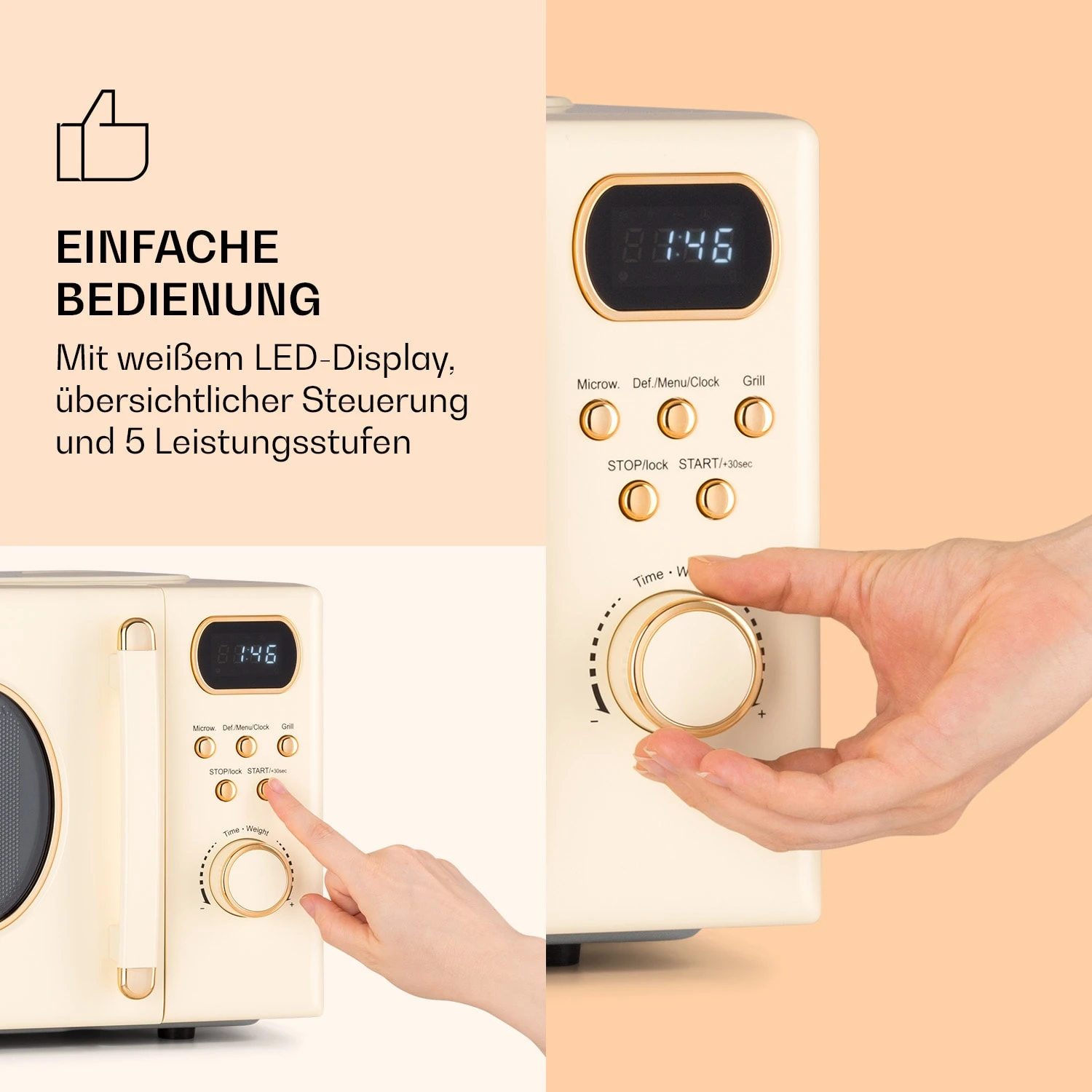 Hier dreht sich alles um köstliche Mahlzeiten und leckere Snacks! Die Julieta von Klarstein ist eine leistungsstarke Mikrowelle mit Grillfunktion mit einem Volumen von 20 Litern und einem 25,5 cm großen Drehteller. 3 Grill- und 5 Leistungsstufen lassen keine kulinarischen Wünsche offen, während du mit den 8 Auto-Programmen die gängigsten Gerichte besonders einfach und bequem zubereiten kannst. Super praktisch ist auch die Auftau-Funktion, bei der sich die nötige Arbeitszeit mit Hilfe einer Gewichtsskala einstellen lässt. In Kombination mit ihrem stilechten Retro-Look der 50er Jahre ist sie ein Highlight in jeder Küche.