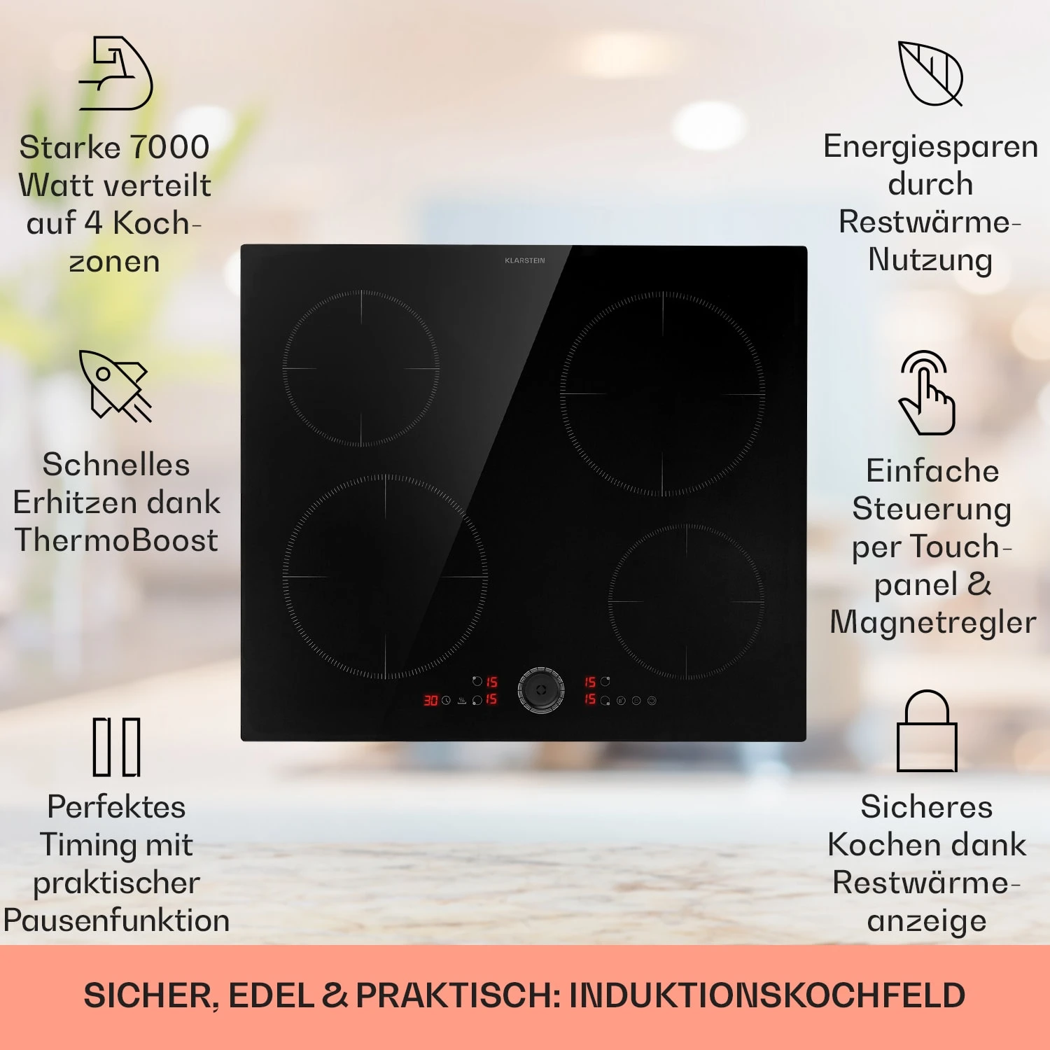 - Touch-Bedienfeld mit Digitalanzeige für Betriebsstufe, Timer und Restwärme