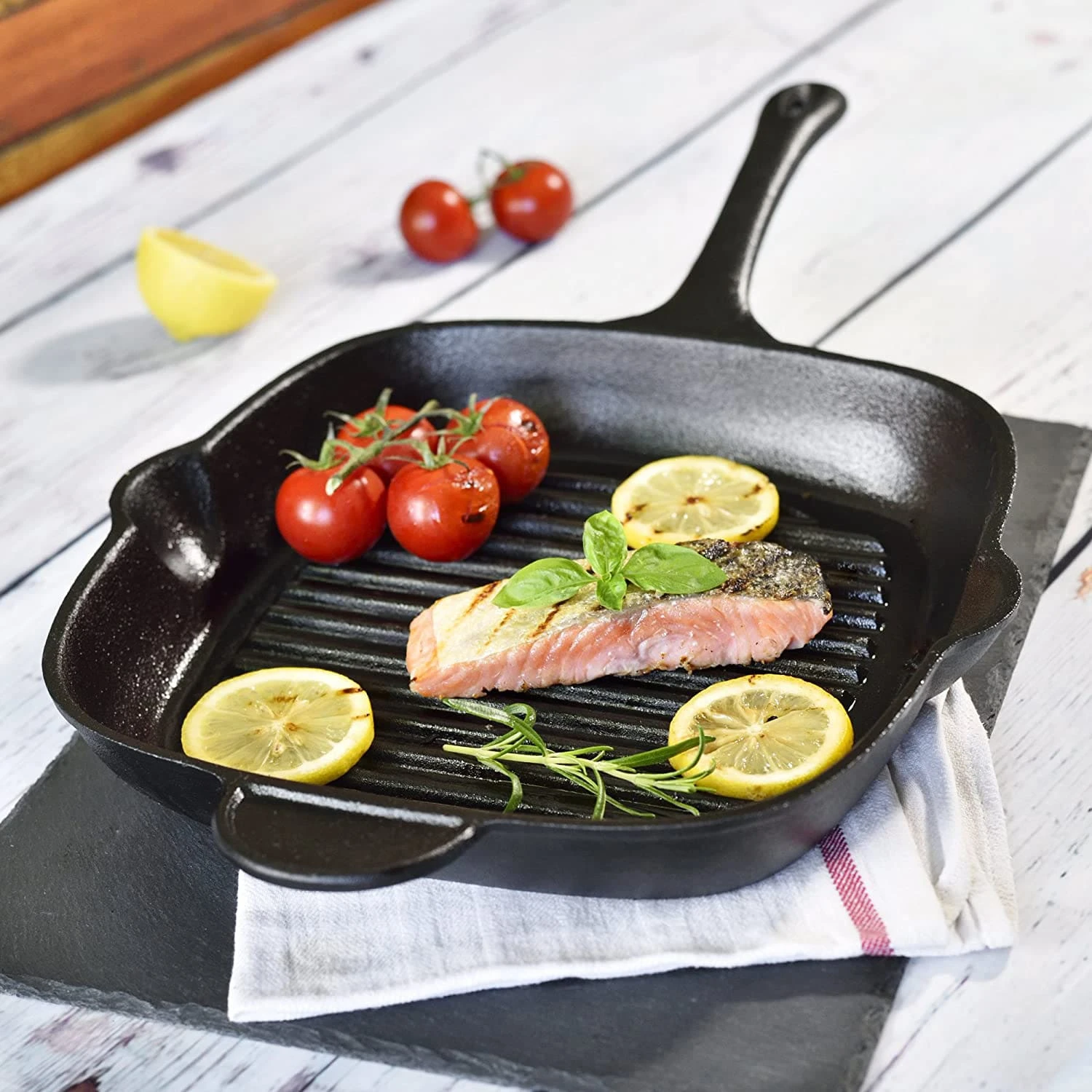 Langlebig und universal einsetzbar: Die Klarstein Malvi Grillpfanne ist aus robustem Gusseisen gefertigt, das für eine optimale Hitzeverteilung sorgt. Egal ob auf dem heimischen Herd, im Backofen oder beim Outdoor-Kochen. Ideal für Steaks, Würstchen, Bratkartoffeln sowie Gemüse und Eierspeisen. Der geriffelte Boden sorgt dabei für die typischen Grillstreifen. Die Malvi ist bereits voreingebrannt und sofort einsatzbereit. Für ein einfaches Handling liegt der Bratpfanne noch eine Griffschutzhülle aus Silikon bei.