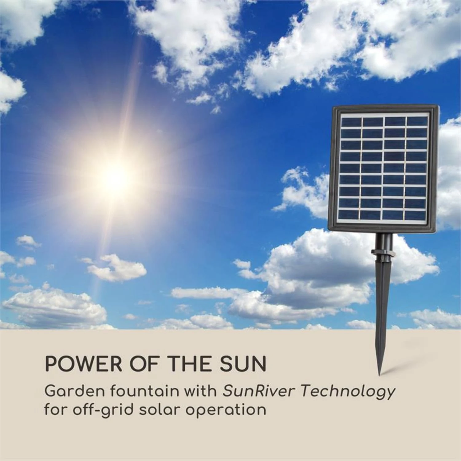 Die Sunriver Technology des Blumfeldt Mantua Kaskadenbrunnens sorgt mit einem 9 V / 2,8 W Solarpanel und dem integrierten Li-Ionen-Akku dafür, dass der Brunnen völlig stromnetzunabhängig arbeitet. Dank der Stromspeicherung im Akku ist sogar ein Nachtbetrieb von bis zu 5 Stunden möglich. Entspannen und Genießen: Sanft plätschernd ergießt sich das Wasser im stetigen Schwall über die vier Stufen des Brunnens. Und dank des Arbeitsprinzips im LoopFlow Concept ist dafür kein Wasseranschluss oder Nachfüllen nötig, die leistungsstarke Mini-Pumpe hält das einmal eingefüllte Wasser in stetigem Umlauf. Dabei sorgt sie für bis zu 100 cm Wasserhub und befördert bis zu 200 Liter Wasser in der Stunde.