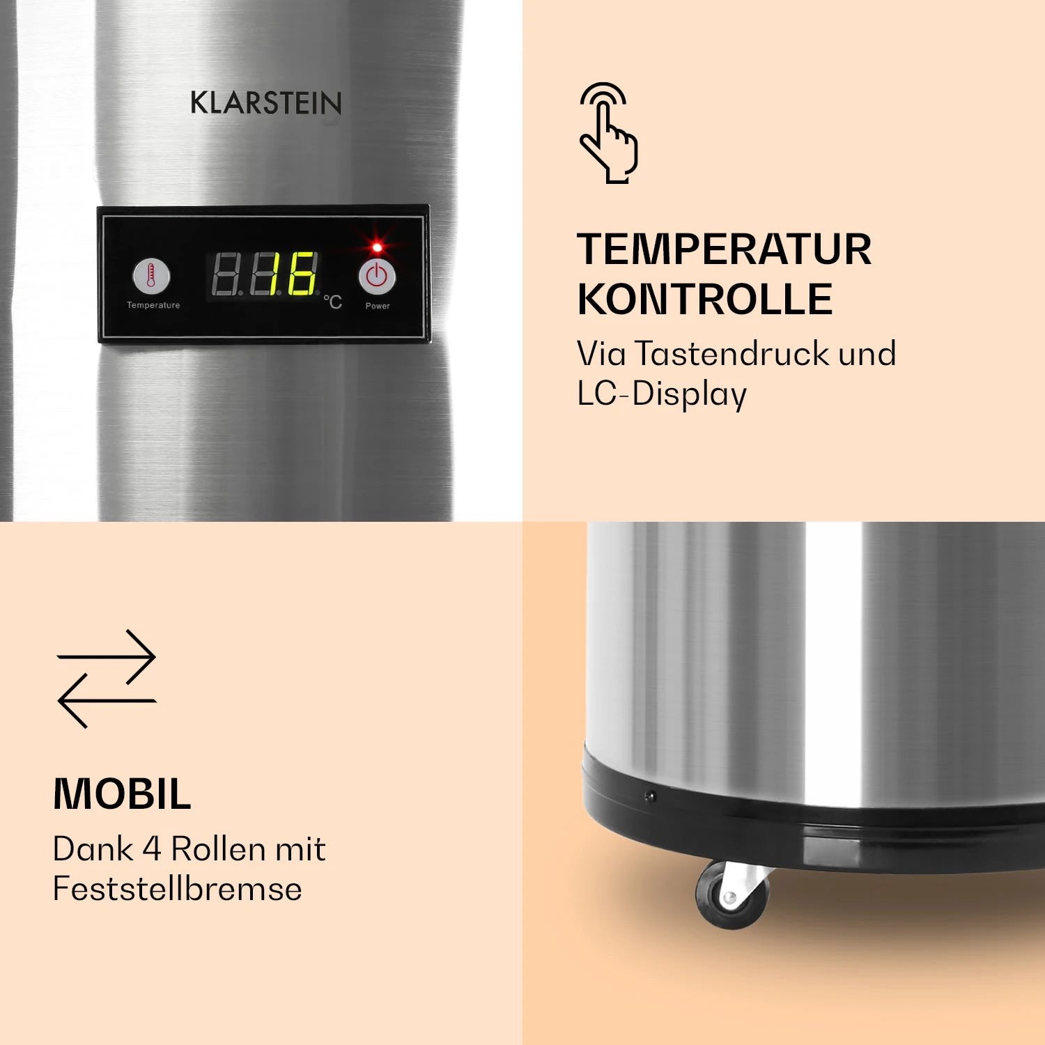 Der Klarstein Mr. Barbot ist ein transportabler Bar-Kühlschrank, der dich mit seinen 50 l Fassungsvermögen bei der Kaltgetränkeversorgung unterstützt. Sein Glasdeckel an der Oberseite lässt sich mittig aufklappen, was die schnelle Getränkeentnahme vereinfacht. Mit seinen vier Rollen und den an der Oberseite angebrachten Handgriffen lässt sich Mr. Barbot problemlos dorthin bewegen, wo er gebraucht wird. Die vier mitgelieferten Getränkekörbe kannst du innen und außen am Getränkekühler anhängen und halten so deine Flaschen kalt oder griffbereit.