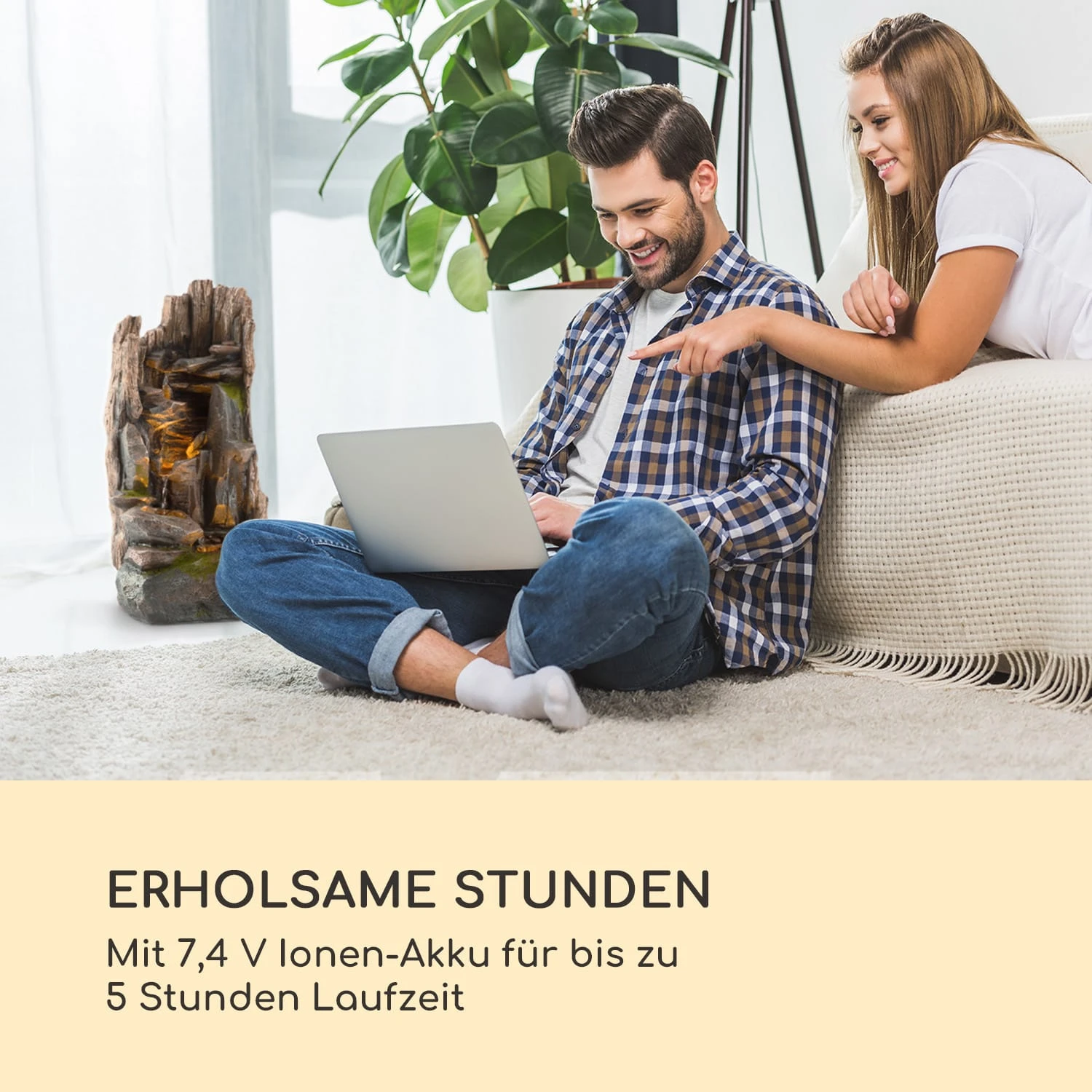 Durch das leichte Gewicht und das resistente Material kannst du diesen schönen Brunnen im Garten, auf der Terrasse oder in Innenräumen aufstellen, sogar im Winter. Dank des Lithium-Ionen-Akkus läuft er auch, wenn das dazugehörige Solarpanel nicht direkter Sonneneinstrahlung ausgesetzt ist. Die Stromversorgung ist hier für einige Stunden gegeben. Dank der leistungsstarken Pumpe und dem LoopFlow Concept bewegt sich das Wasser im ständigen Kreislauf über die Kaskaden.