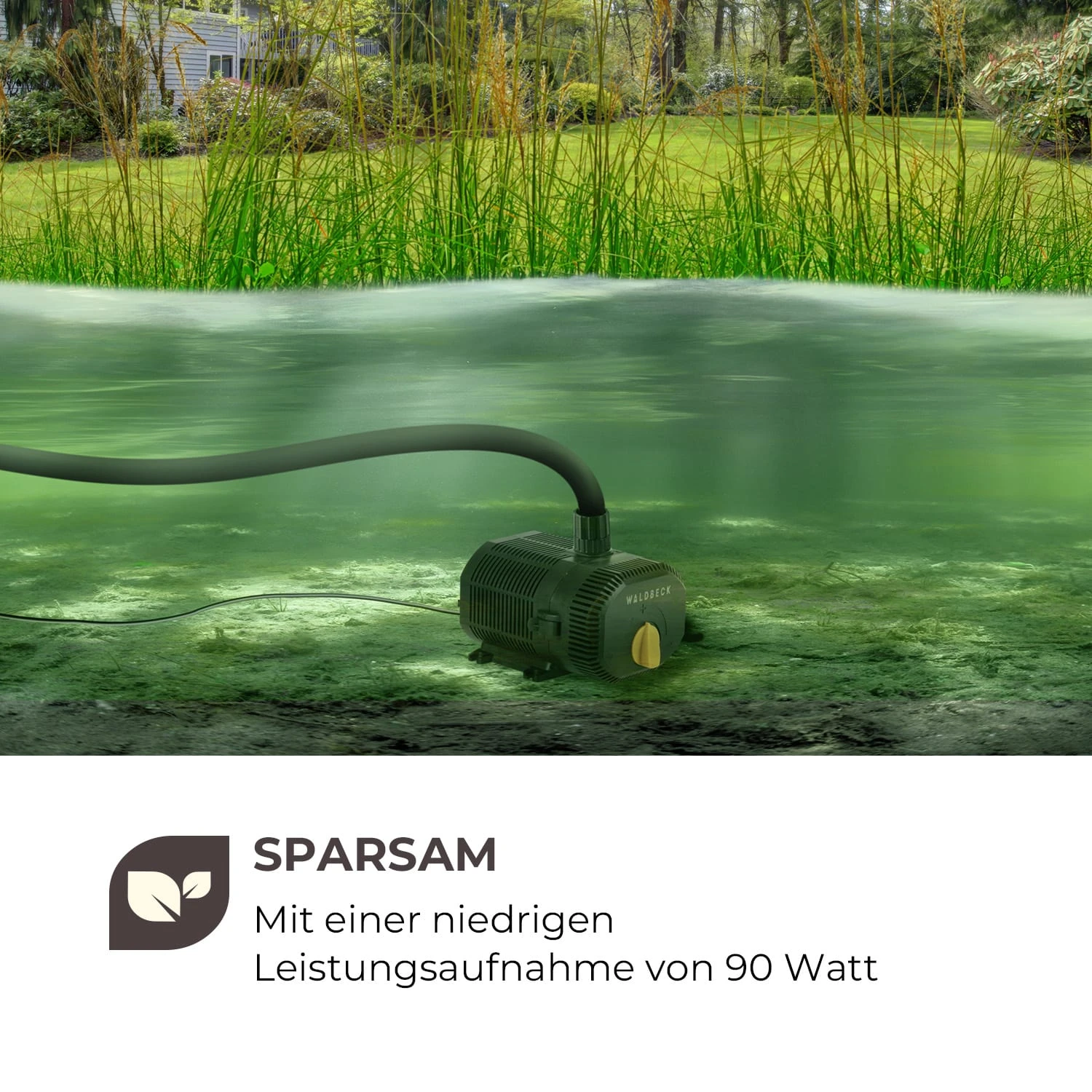 Durch einen sparsamen Verbrauch ist die Pumpe der ideale Helfer bei der dauerhaft notwendigen Wasserumwälzung in Bachläufen und Fischteichen. Auch zum Betrieb eines Springbrunnens oder zur Förderung von Wasser aus Regentonnen ist die Nemesis T90 bestens geeignet. Mit ihrer Förderung von bis zu 6200 Litern pro Stunde bewegt sie große Wassermengen und kann somit die notwendige Sauerstoffzufuhr im Gewässer sicherstellen. Für den einfachen Anschluss liefert die Teichpumpe ein Adapterset inklusive Dichtungsring mit, das die Verbindung mit 3/4“- und 1“-Schläuchen ermöglicht. Zur einfachen Reinigung des Pumpensystems verfügt die Waldbeck Nemesis T90 über ein Schnellentriegelungssystem, um sie mit wenigen Handgriffen zu zerlegen. Ein Filterkorb verhindert zudem, dass Laub oder Wasserpflanzen ins Innere der Teichpumpe gelangen können. Für einen festen Stand sorgen 4 Gummistandfüße und die Sicherheit ist dank Schutzklasse IPX8 jederzeit gewährleistet.