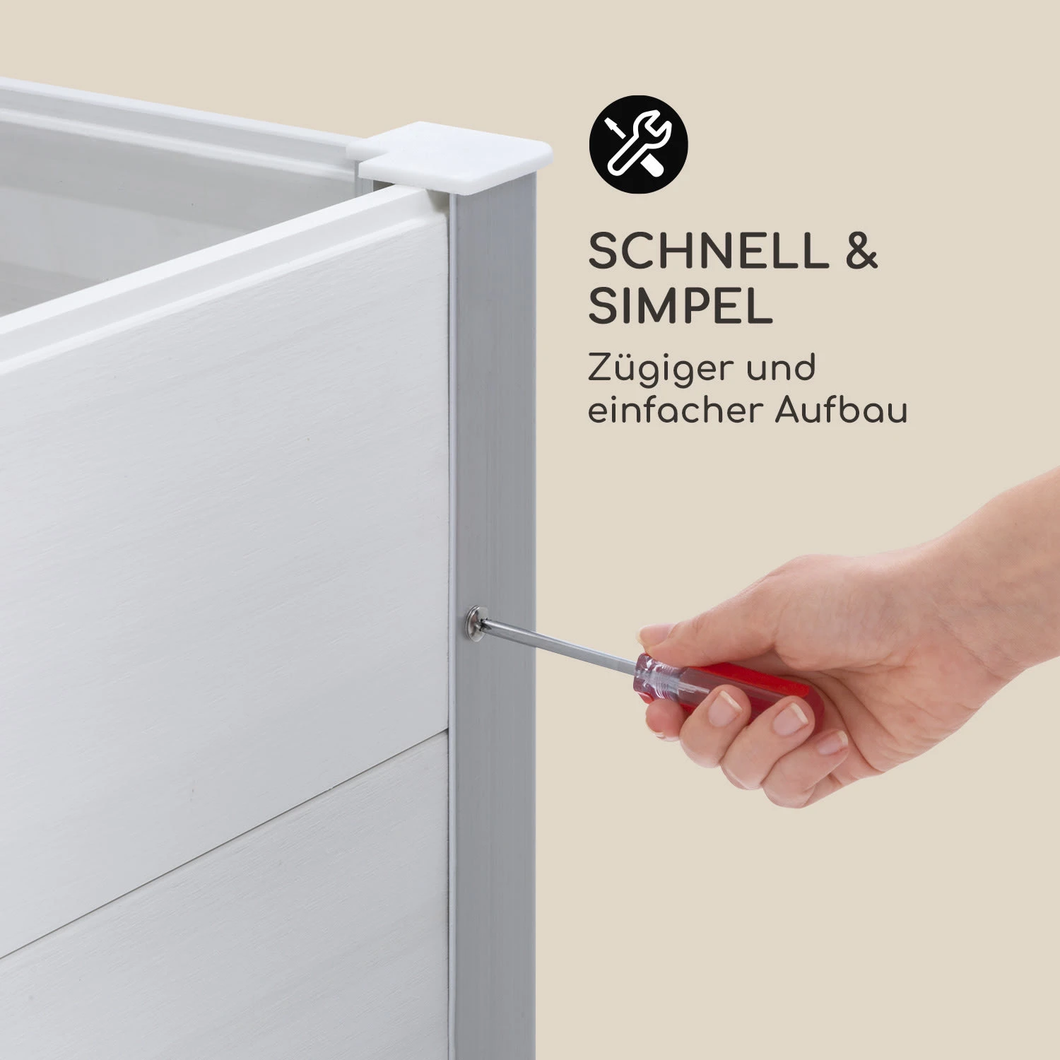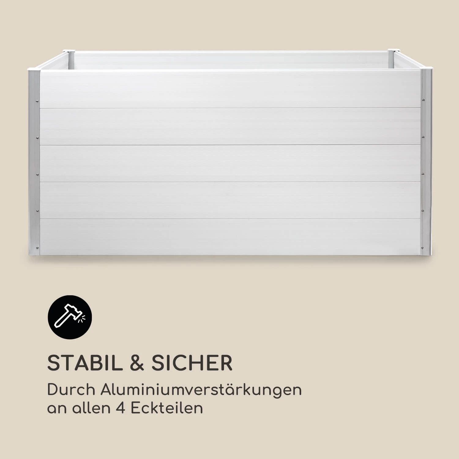 Das stabile Gartenbeet ist aus wetterbeständigem WPC (Wood Plastic Composite) gefertigt und dank UV-, Rost- und Frostschutz bestens für den dauerhaften Einsatz im Außenbereich geeignet. Mit ihrer natürlichen Holzoptik fügt sich die Konstruktion ideal in jedes Garten- und Terrassenambiente ein und wertet ihre Umgebung dank einer Farbgebung in schlichtem Weiß eindrucksvoll auf. Mit 91 cm verfügt das Nova Grow über eine besonders angenehme Höhe, die sowohl beim Bepflanzen als auch beim Ernten ein rückenschonendes Arbeiten ohne mühsames Bücken ermöglicht. Das Hochbeet kann in nur kurzer Zeit aufgebaut werden und verspricht dank Aluminiumverstärkungen an allen 4 Eckteilen eine besonders hohe Robustheit und Stabilität.