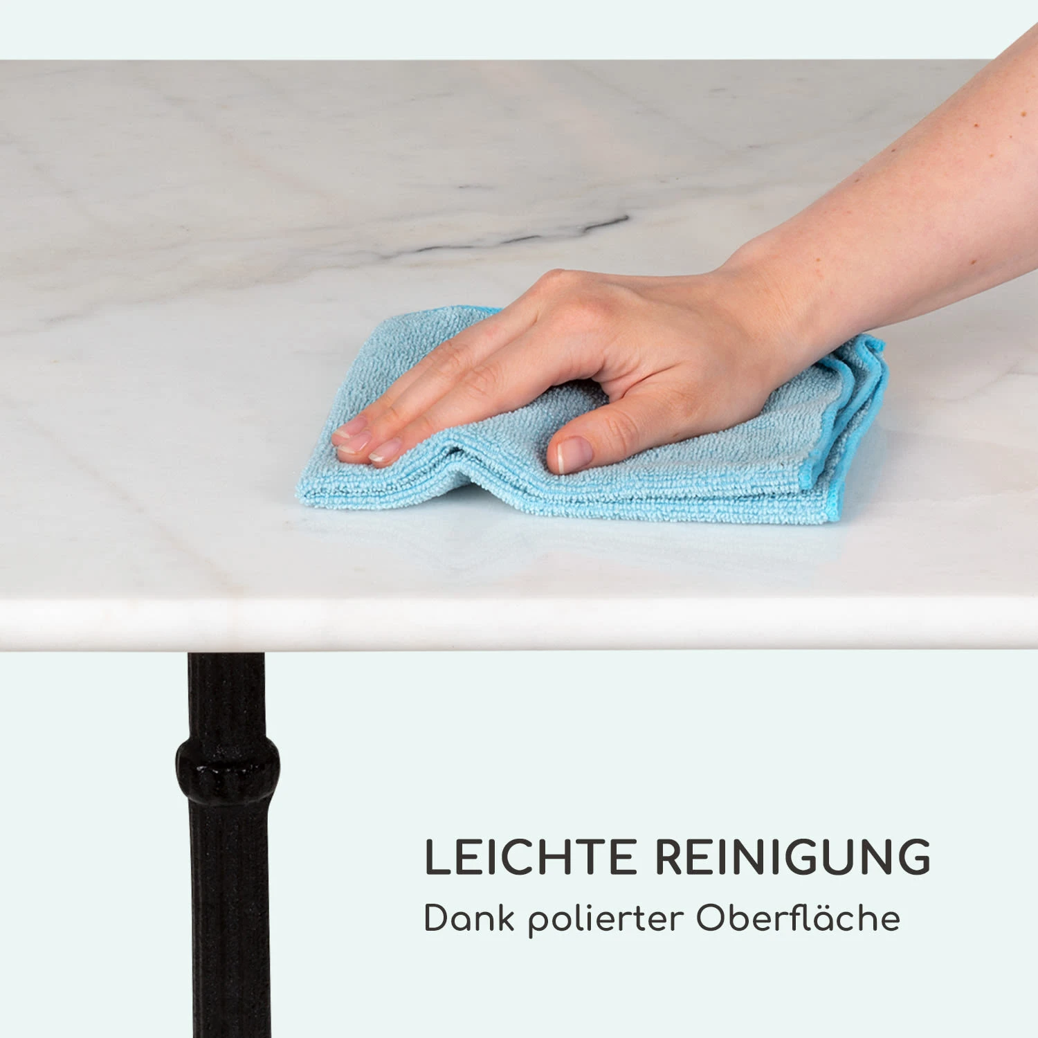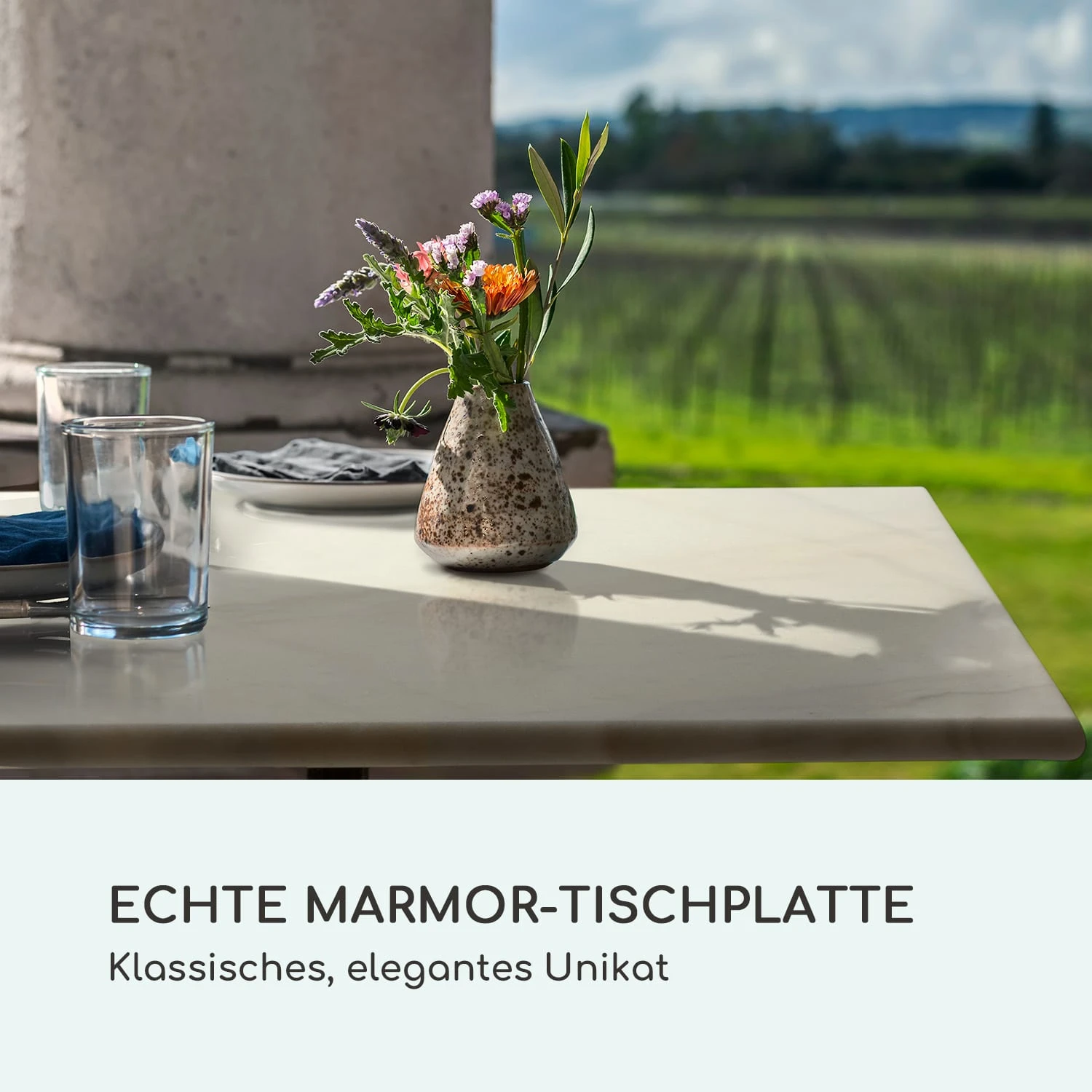 Luxuriöser Genuss mit Jugendstil-Atmosphäre – das verspricht dir der blumfeldt Patras Onyx Gartentisch und zieht dabei alle Register: Die quadratische Tischplatte ist aus sauber poliertem, echtem Marmor. So ist dieser Tisch ein Unikat – denn Maserung und Färbung des Gesteins bringen immer wieder einen ganz eigenen Charakter hervor und verleihen jedem Umfeld neuen Glanz. Diese prachtvolle Erscheinung wird durch den stabilen gusseisernen Standfuß mit Verzierungen zusätzlich verstärkt. Egal ob für das Frühstück auf dem Balkon, zum geselligen Kaffee auf der Terrasse oder das romantische Candle Light Dinner unterm Sternenhimmel: Der blumfeldt Patras Onyx Marmortisch sorgt für ein außergewöhnliches Ambiente.