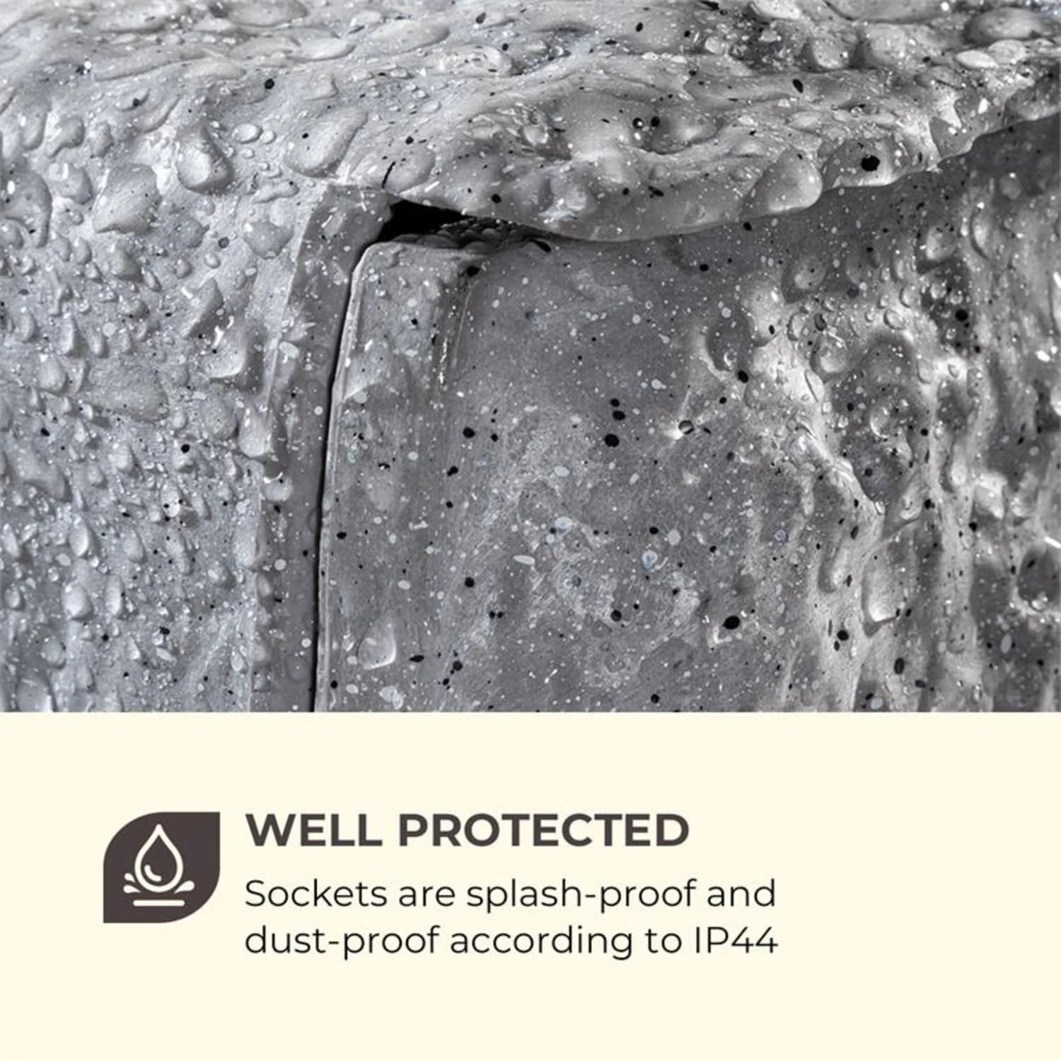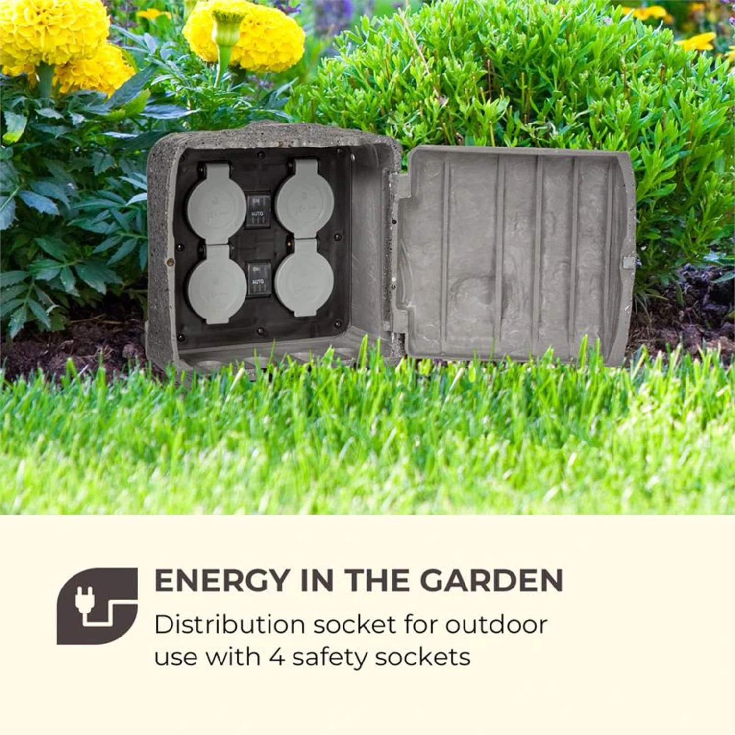 Energie im Garten oder Hof. Mit der Waldbeck Power Rock Twilight Steinsteckdose ist völlig witterungsfest immer ein Anschluss für den Rasenmäher, Elektrogrill oder die Partybeleuchtung verfügbar – ganz ohne Verlängerungskabel.