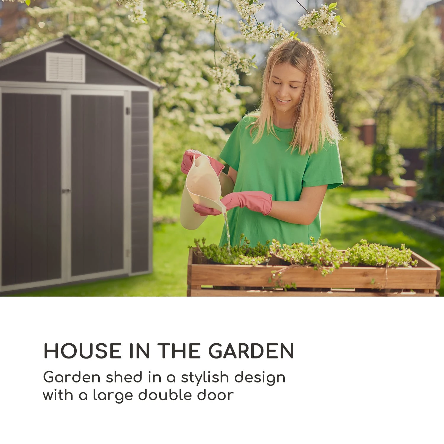 Die blumfeldt Schatzkammer sorgt nach getaner Gartenarbeit zuverlässig für Ordnung und bietet idealen Schutz für Werkzeug, Gartengeräte und Gartenmöbel vor Sonneneinstrahlung, Rost- und Schimmelbildung. Das schmucke Häuschen aus resistentem PVC verfügt mit seinen Maßen von 170 x 218 x 170 cm nämlich nicht nur über jede Menge Stauraum, sondern bewahrt sämtliche Geräte und Möbel dank Witterungs- und UV-Schutz auch ganzjährig vor Wind und Wetter. Eine Ventilationsöffnung sorgt zusätzlich für eine kontinuierliche Belüftung, während das Seitenfenster den Innenraum mit ausreichend Licht versorgt. Eine verriegelbare Doppeltür hält außerdem alle unliebsamen Besucher vom Eintritt in den Geräteschuppen ab. Für noch mehr Sicherheit kann zusätzlich ein Vorhängeschloss angebracht werden. Mit ihrem stilvollen Äußeren fügt sich die Schatzkammer darüber hinaus perfekt in jedes Gartenambiente ein.