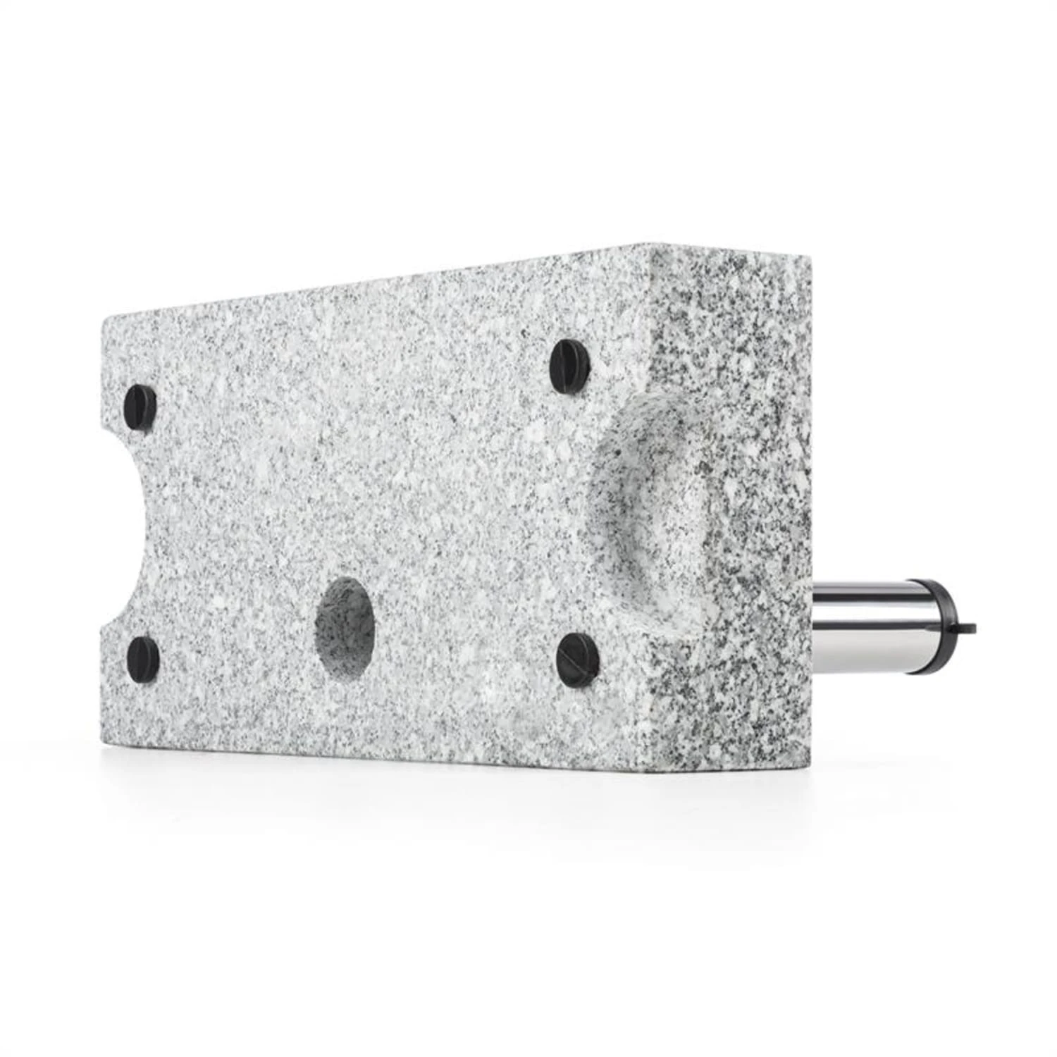 In seinem, auf Hochglanz polierten, extrem robusten Edelstahl-Schaft finden Schirme mit einer Stammdicke von 3,5 bis 4 cm Platz. Ein Kunststoffring verhindert den direkten Kontakt zwischen Schaft und Schirmstamm. Zwei Stellschrauben an der Halterung sichern den Schirm und verleihen ihm zusätzliche Standfestigkeit im Ständer. Der Edelstahlflansch am Übergang zum Stein bietet dabei zusätzliche Stabilität.