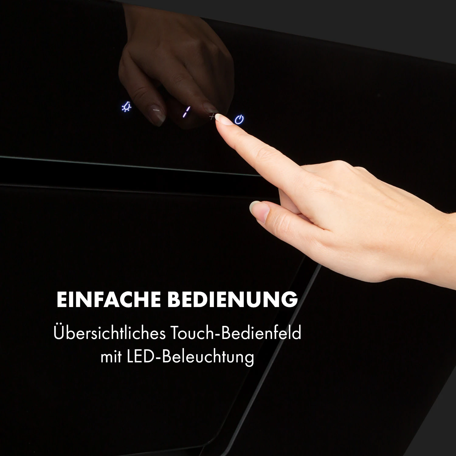 Die Arbeitsleistung der Sofia Dunstabzugshaube mit einer stilvoll aufstrebenden Front aus Glas kann dank mehrerer Leistungsstufen unkompliziert an den Kochvorgang angepasst werden. Auf der höchsten Stufe befördert sie bis zu 300 m³/h Abluft und sorgt dadurch für eine geruchsneutrale Küche. Dank modernster Technik halten sich dabei Geräuschaufkommen und Energieverbrauch im angenehm niedrigen Bereich mit gerade einmal 65 dB und Energieeffizienzklasse B. Eine zuschaltbare LED-Lampe leuchtet das gesamte Kochfeld aus und garantiert den Überblick über das Kochgeschehen. Sämtliche Bedienelemente sind als übersichtliches Touchpanel direkt in die Oberfläche integriert. Alles nötige Material zur Wandmontage, ein Abluftschlauch sowie die passende Kaminverblendung sind darüber hinaus im Lieferumfang enthalten. Mit Hilfe von Aktivkohlefiltern (Artikel 10035567) kann die Sofia auch vollkommen unkompliziert auf Umluftbetrieb umgerüstet werden.
