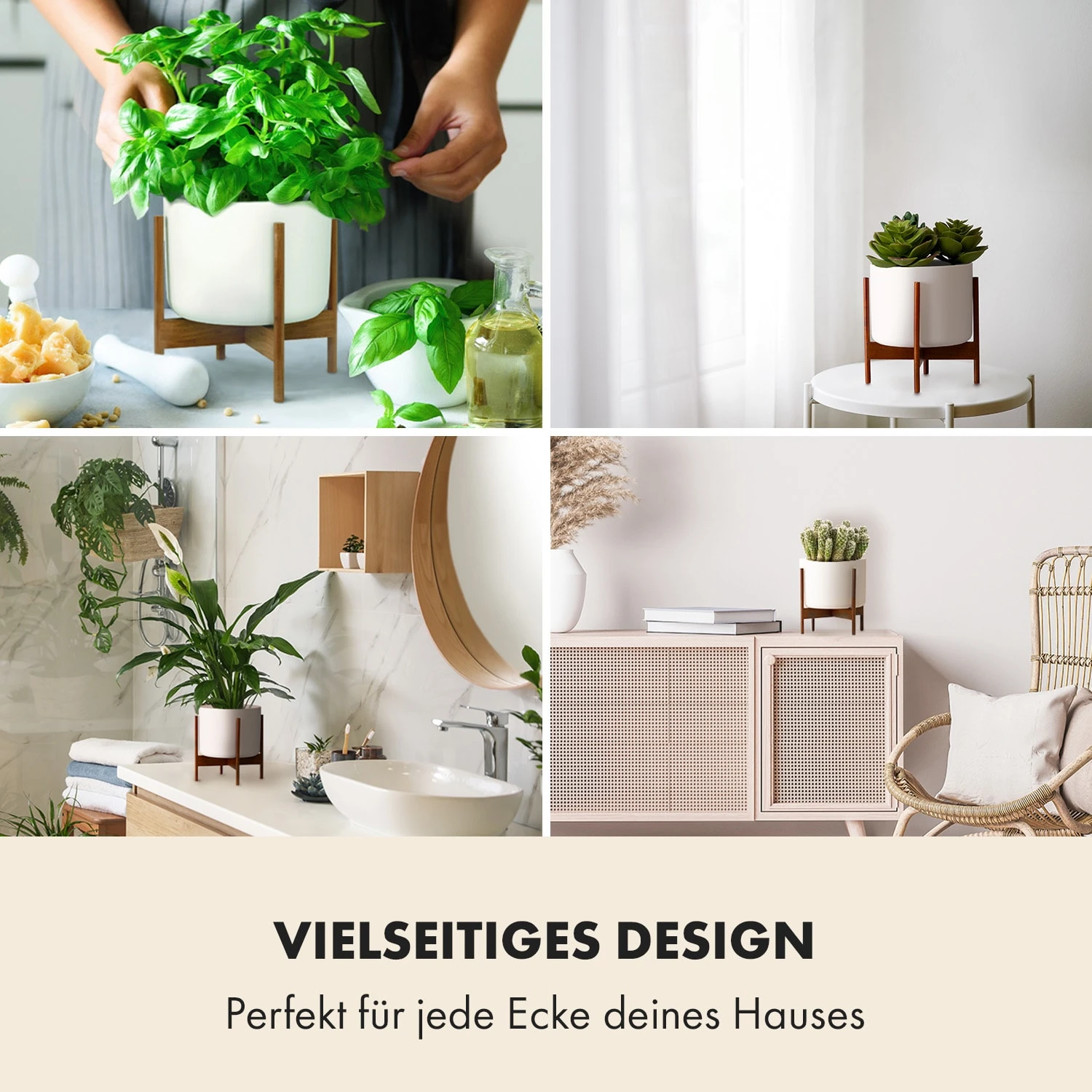 Der Pflanzenhalter ist hergestellt aus hochwertigem Akazienholz, was ihm eine luxuriöse Optik verleiht. Zudem ist Akazienholz für seine Nachhaltigkeit bekannt, da es besonders schnell wächst. Der passende Blumentopf aus weißer Keramik wird gleich dazu geliefert und bildet einen edlen Kontrast zum dunklen Holz.